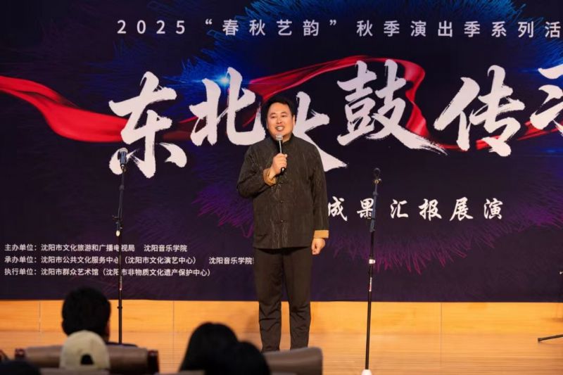 展演伊始,刘小龙为本次展演致辞。他指出,东北大鼓作为我国传统曲艺的杰出代表,以其独特的艺术魅力和深厚的文化内涵,成为东北人民精神文化生活中不可或缺的重要组成部分。沈阳音乐学院作为“鲁艺”的传承者,肩负着弘扬民族精神、传承民族文化的使命。多年来,学院深耕东北地域文化沃土,致力于民族民间音乐的研究、保护与教学实践。此次展演,不仅是对传习班学习成果的集中展示,也是东北大鼓在新时代传承发展的生动写照。学院将在未来持续深化与沈阳市文化旅游和广播电视局等相关部门的合作,进一步推动东北大鼓的保护与传承,不断完善非遗传承体系,打造更多具有影响力的文化品牌和艺术活动。