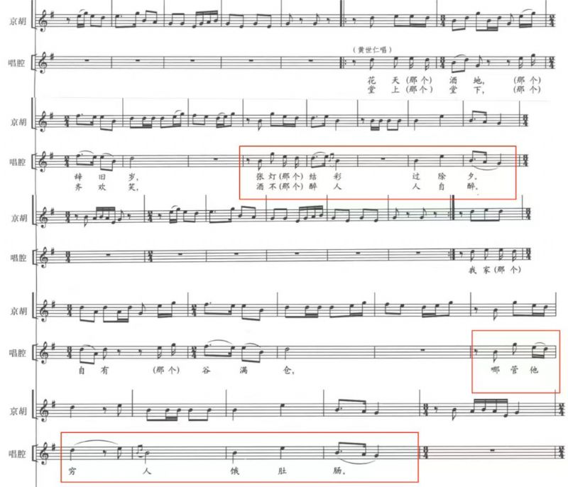 如“谱例1”所示:“张灯(那个)结彩过除夕”和“哪管他穷人饿肚肠”两句唱腔在旋律上变头合尾,具有很强的相似性;同时运用的六度大跳,重现出了黄世仁作为一个醉酒之人的语气轻浮。但在相似的唱腔下,所呈现出的社会场景却是一对鲜明的现实对比:一边是以黄世仁为代表的地主阶级,通过剥削实现了“欢天喜地过新年”的虚伪场面;一边是被剥削的劳苦穷人饥肠辘辘。这样残忍的社会现实对比本理应激起黄世仁同理心,但他却将这当作了酒足饭饱后,自己能够洋洋得意的资本所在。
