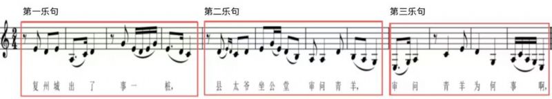 《北风吹》的第二段唱段《我盼爹爹心中急》,改编自河北民歌《青羊传》,对应剧情中“喜儿”苦等爹爹七天未归、内心焦虑不安的场景,核心情感诉求是传递“喜儿”对父亲的深切思念与担忧牵挂。河北民歌《青羊传》原型为六个乐句结构,采用徵调式,2/4拍,曲调叙事性极强,节奏规整平稳,善于通过舒缓流畅的旋律推进故事表达。如经典唱段“复州城出了桩事啊,李家的郎,刘家的女,两家结亲未成双,姑娘她早早命见阎王”,以清晰的乐句结构与明快的节奏韵律,高效承载叙事内容,展现出极强的叙事表现力。