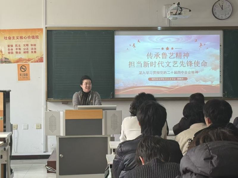 • 为深入学习贯彻党的二十届四中全会精神,引导青年学子传承鲁艺精神、担当时代使命,11月26日,现代音乐学院党总支书记郑晓丹,院长张媛分别为流行器乐系学生讲授思政课与形势政策课。