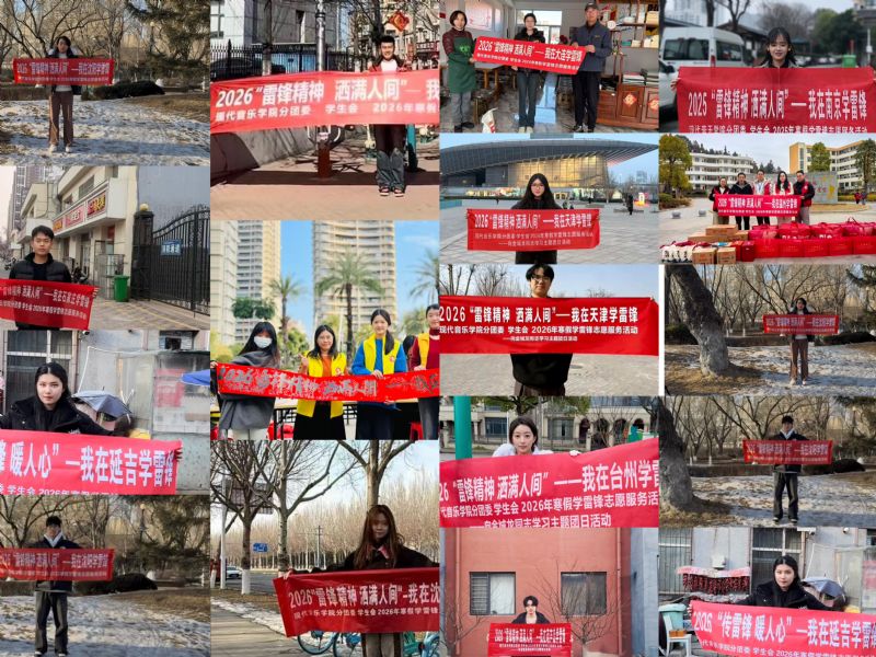 为深入贯彻习近平总书记关于弘扬雷锋精神的重要指示精神,落实立德树人根本任务,致敬并学习辽宁“时代楷模”金城龙同志的先进事迹,现代音乐学院分团委于2026年寒假期间组织开展了第四届“雷锋精神洒满人间”——我在家乡学雷锋主题实践活动。17名学生干部代表以“每人一件好事”为载体,分别在9省12个城市,在家乡的土地上用实际行动传承雷锋精神,用赤诚担当致敬英雄楷模,以奉献之光照亮乡土大地。