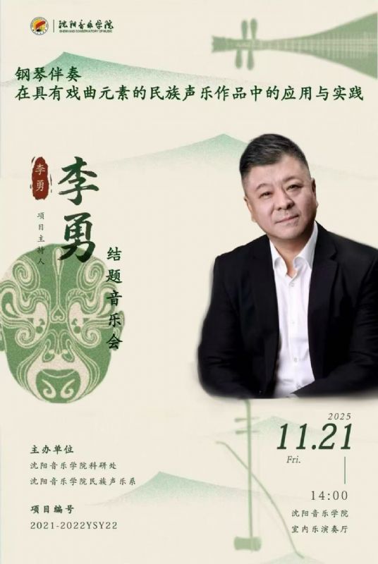 • 预告|民族声乐系李勇教授——结题音乐会 《钢琴伴奏在具有戏曲元素的民族声乐作品中的应用与实践》