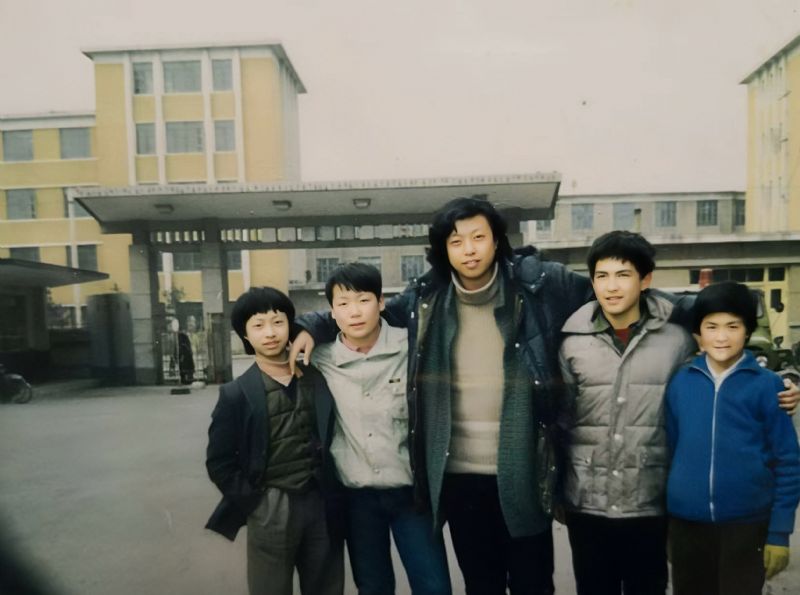 1986年王宇(右二)与班主任郑佐(中)及同学在学院合影