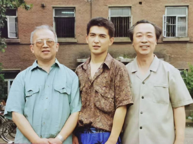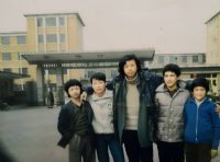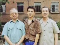 王宇与金石老师(左一)周泰老师 (右一) 于附中原教学楼前合影