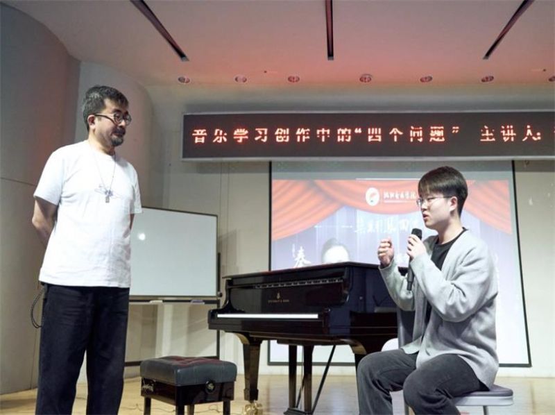 在讲座中,秦四风以“音乐学习创作中的四个问题”为核心框架,精准聚焦音乐学习与创作中的共性困惑,从演唱演奏、作词作曲、编曲制作到录音混音,层层拆解不同环节的实践要点。他特别围绕“古典与流行的对话”“艺术与技术的融合”两大维度展开深度解读,用通俗的表达梳理两类音乐的发展脉络与理念差异,带领师生探索音乐哲学的深层内涵,为大家提供了兼具理论高度与实践价值的创作思路,助力学子深化对音乐创作的认知。
