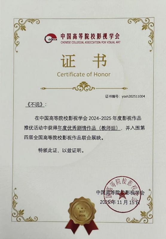 戏剧影视学院影视摄影与制作系主任胡春桥原创作品《不说》在本次推优活动中从1975部作品脱颖而出,获得年度优秀剧情作品(教师组),并入围第四届全国高等院校影视作品联合展映。
