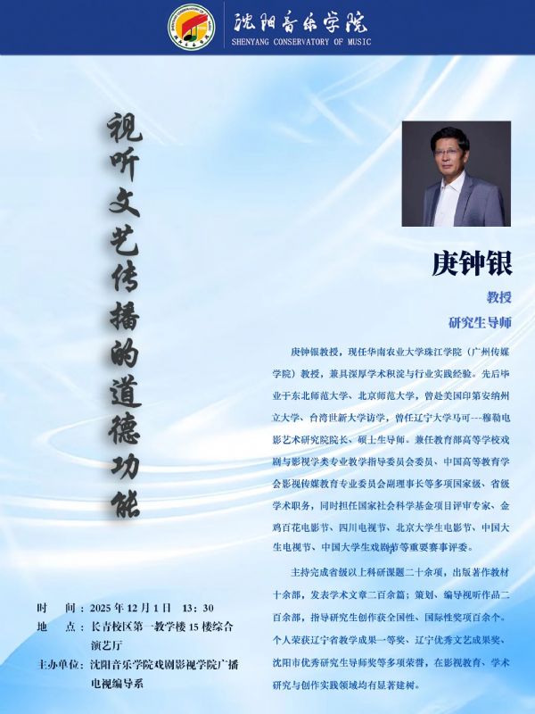 讲座预告:华南农业大学珠江学院庚钟银教授主讲《视听文艺传播的道德功能》
