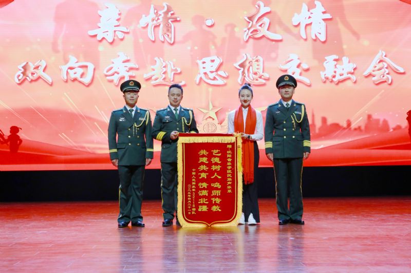 在“亲情·友情”双向奔赴思想交融会上,小分队队员倾情演唱了《母亲》《父亲》《妻子》等歌曲,向卫国戍边的解放军官兵和家属致以崇高的敬意和真挚的祝福。师生们深情的歌声引来官兵们阵阵喝彩和热烈掌声。部队代表向民族声乐系赠送了“艺德树人鸣师传教 共建共育情满北疆”的锦旗,对民族声乐系在交融共建演出工作中的突出表现给予高度赞赏和诚挚感谢。近两千名官兵在演出现场或通过线上直播平台同时观看了交融会。