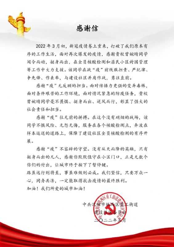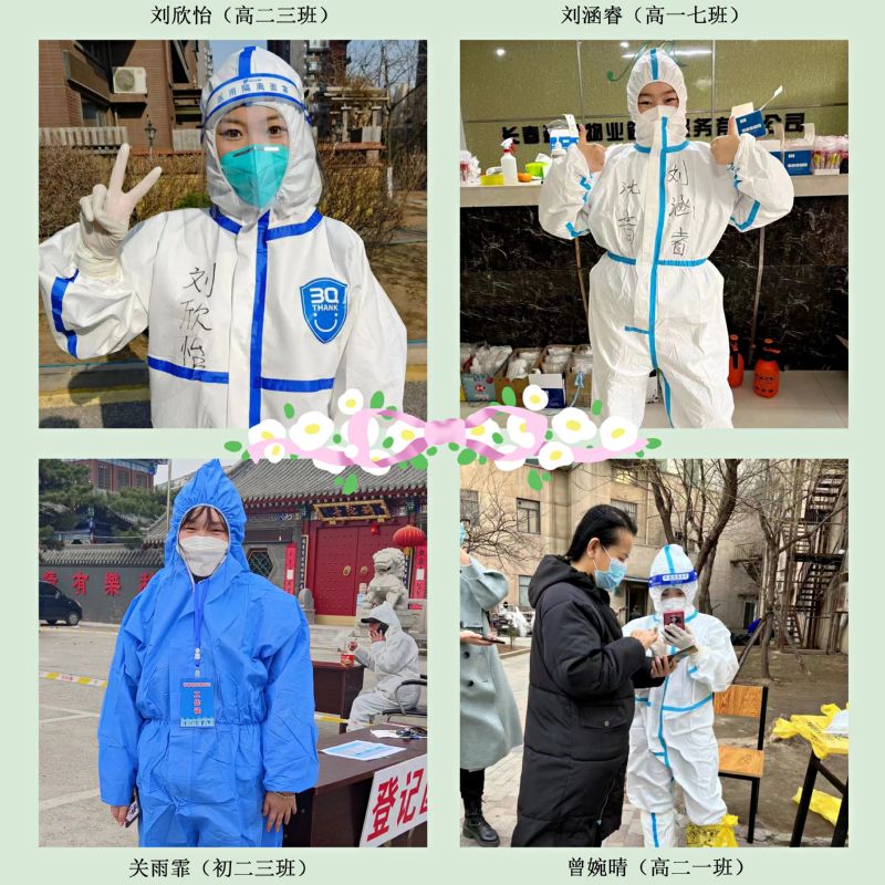 高二一班曾婉晴同学面对再次暴发的疫情,闻令而动,挺身而出,积极参加铁西区重工街道全员核酸检测和居民小区封园管理等工作,在战“疫”前线敢担责、严纪律、争先锋、作表率。
