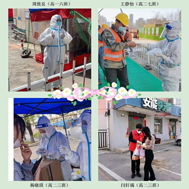 高二三班闫轩瑀同学于4月份多次在沈阳市浑南区桃仙街道桃仙社区参加核酸检测的志愿服务,负责查验进出小区人员的出入证明、测量体温的工作。