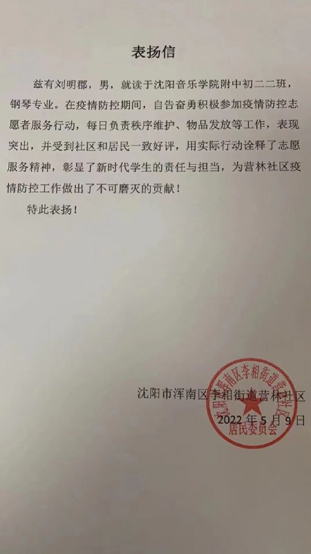 初三二班刘禹彤同学自3月份开始,长期在沈阳市和平区南湖文化路社区参加志愿服务,发放核酸检测卡片工作。