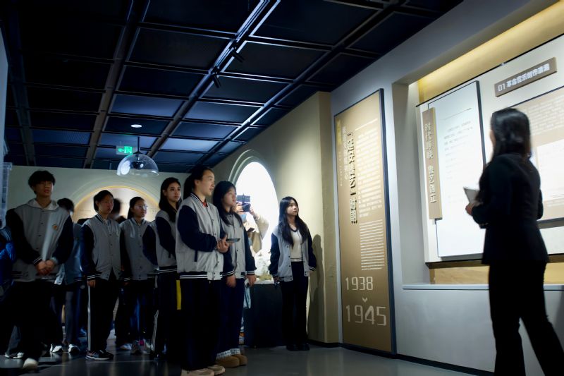随后,在馆内专业讲解员的引导下,学子们沿着“延安鲁艺——东北鲁艺——沈阳音乐学院”的时间脉络有序参观各展区。360米展线上,500余张照片与百余件实物串联校史:李劫夫创作《我们走在大路上》的发黄手稿上,字迹依旧透着激昂力量;秦咏诚《海滨音诗》的乐谱间,能窥见老一辈音乐家对艺术的极致追求;霍存慧用于创作《提灯游行》的手稿旁,详细记录着他将古筝、二胡等民族乐器融入西洋管弦乐的创新历程。而展区中央的“鲁迅文艺学院”校牌,以斑驳的字迹诉说着学校“从延安走来”的红色过往,让学子们直观感受鲁艺精神的传承脉络。