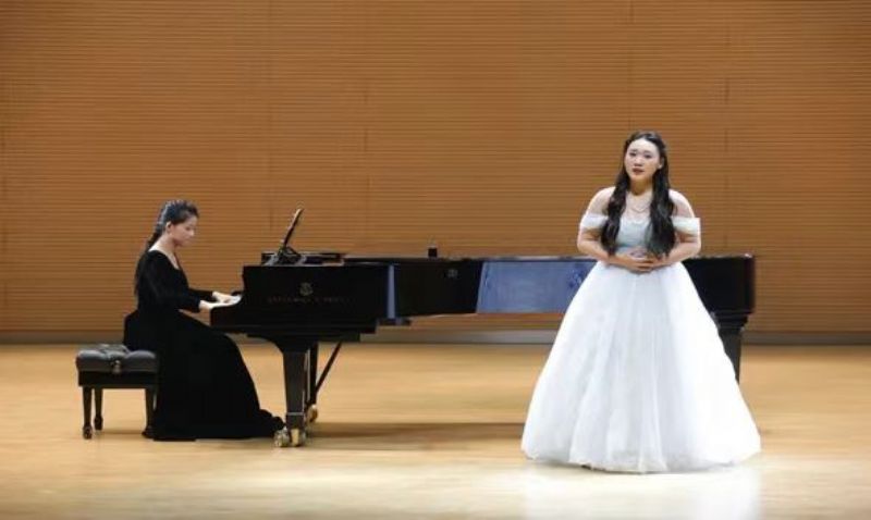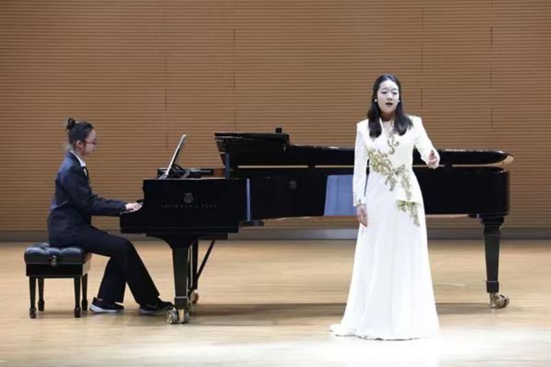 音乐会在饱含希望的序曲中缓缓拉开帷幕。首演曲目《向上,少年》由社会教育培训中心研究员王珉珠作词、高一二班何欣怡作曲,高二四班王思雯倾情献唱,作曲者何欣怡亲自担任钢琴伴奏。作品以鲁艺精神传承为内核,旋律激昂向上,生动展现了新时代青年勇担使命、奋勇争先的精神风貌。