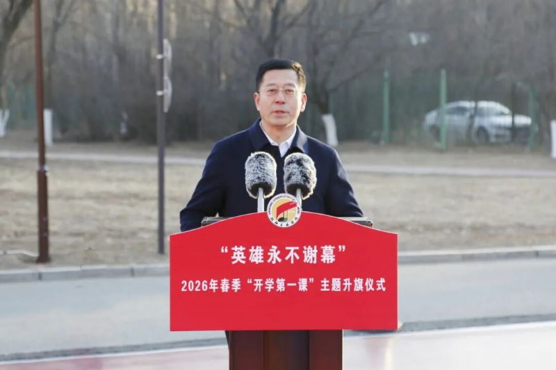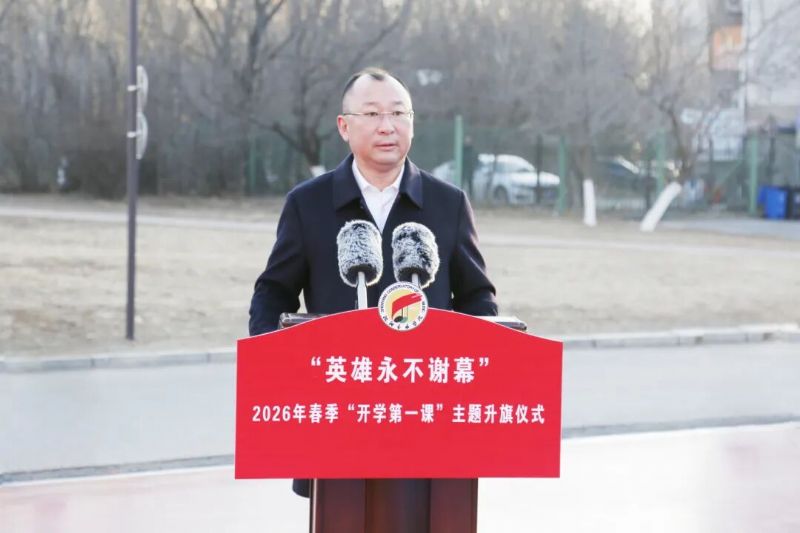 赵恒心在升旗仪式上讲话。他深情指出,英雄精神是引领时代前进的灯塔。英雄或许并不是做了惊天动地的大事,但一定是在关键时刻奋不顾身的人;英雄或许来自不同岗位、不同领域,但他们身上一定都闪耀着相同的精神光芒——那就是对祖国的忠诚、对人民的热爱、对责任的担当。新时代为奋斗者提供了广阔舞台,新时代更深切呼唤雷锋式的英雄。“辽宁时代楷模”金城龙同志的英雄事迹告诉我们:青春的意义在于担当,信仰的能量不容彷徨,生命的价值不在短长,他没身冰河,却激活了春的希望。站在新学期的起点,他向沈音全体同学提三点希望: