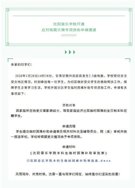 沈阳音乐学院开通应对地震灾情专项资助申请通道