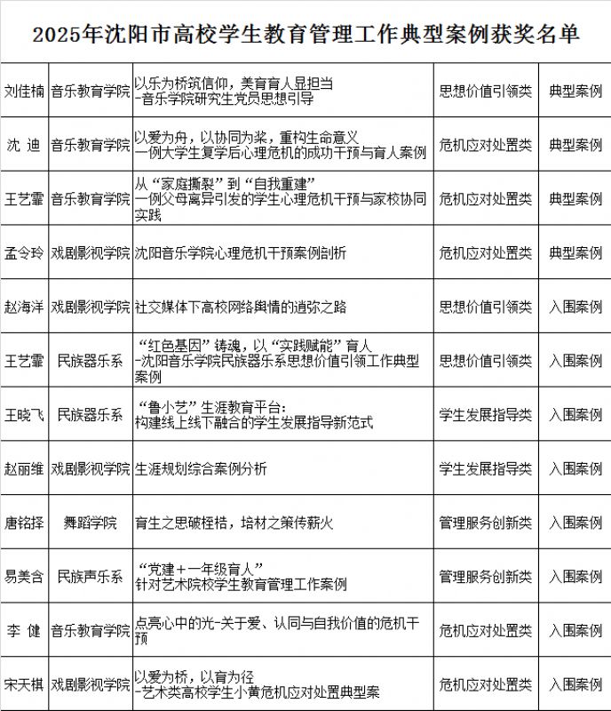 近日,中共沈阳市教科工委公布《2025年高校学生教育管理工作典型案例评选结果》,我院喜获优秀案例12项,其中典型案例4项、入围案例8项,充分展现了我院学生教育管理工作的扎实成效与创新活力。