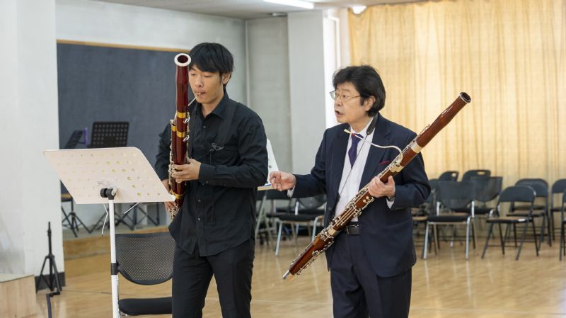 馬込勇教授、今濑康夫教授长期活跃于日本国内各大交响乐团,并致力于国际音乐与教育的交流与合作。在大师班上,馬込勇针对学生在吹奏巴松的技术、情感表现和气息处理等方面进行了指导。今濑康夫以圆号练习曲的演奏为线索,指导学生在吹奏时进行合理的指法变换,讲授了演奏不同音高时应注意的问题,并与我院学生共同合奏了圆号曲目。在讲学过程中,两位教授与我院师生积极互动、亲切交流,现场气氛轻松热烈,学生们了解到更多关于吹奏巴松与圆号的技巧,获益良多。