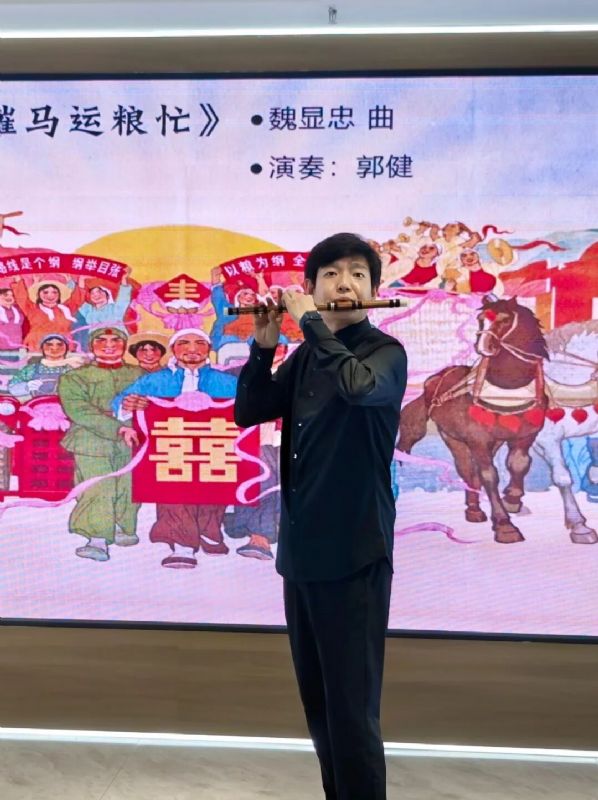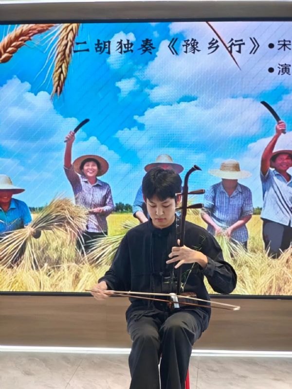 活动现场气氛热烈,社区居民踊跃参与,观众年龄跨度大,最年长者已94岁高龄,充分体现了民族音乐跨越代际、深入人心的独特魅力。演出在2024级硕士研究生郭健同学带来的笛子独奏《扬鞭催马运粮忙》的欢快旋律中拉开序幕,乐曲以鲜明的节奏和生动的表现力,展现了农民丰收运粮的喜悦场景,赢得观众阵阵掌声。
