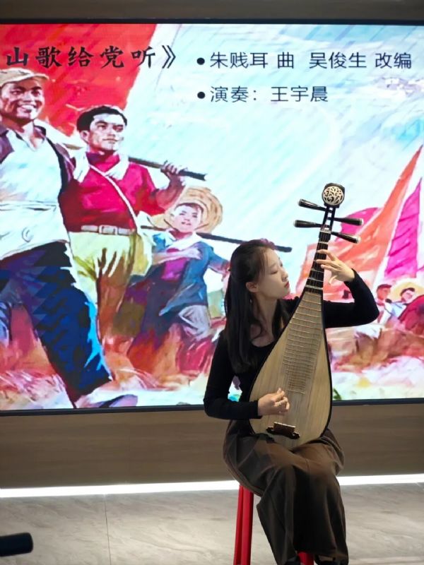 随后,2022级二胡专业学生包佳琦同学演奏的二胡独奏曲《豫乡行》以其浓郁的河南地方风格,带领观众感受中原大地的乡土情怀,旋律质朴动人,情感真挚深沉。2024级硕士研究生王宇晨演奏的琵琶曲《唱支山歌给党听》以细腻的技巧、深情婉转的演奏,表达了对党的无限忠诚与热爱,引发了现场观众的强烈共鸣。