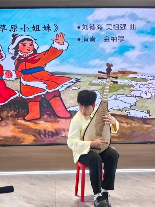 最后一首曲目是特邀沈阳音乐学院附属中等音乐学校民乐学科金纳穆同学演奏琵琶独奏曲《草原小姐妹》,这位附中优秀学生代表以精湛的技艺和饱满的情感,生动描绘了草原儿童的纯真与勇敢,展现了琵琶丰富的表现力与深厚的文化底蕴,将整场演出推向高潮。演出过程中,教师党支部书记汪茜与各位老师还结合每首曲目,向观众简要介绍了乐器的历史渊源、演奏技巧及文化背景,使居民在欣赏音乐的同时,更深入地了解民族器乐的艺术价值与文化内涵。党日活动采用讲演结合的形式进行,不仅提升了演出的专业性,也增强了群众的参与感与获得感。