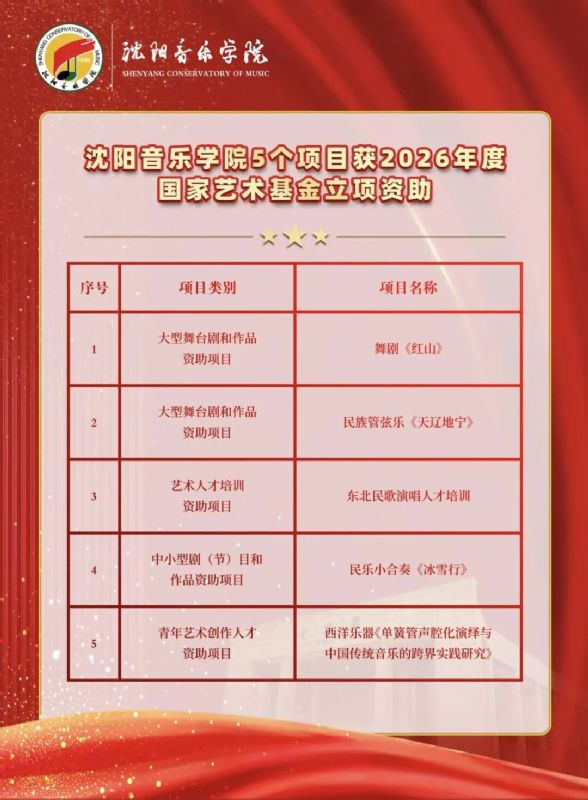 近日,2026年国家艺术基金资助项目名单正式公布,经学院统筹推进、我系聚力实施,大型民族管弦乐项目《天辽地宁》与小型剧节目《冰雪行》双双获批立项,小型项目成果延续、优势稳固,更实现了民族器乐领域在大型国家级艺术项目上的历史性突破!两项获批项目深耕辽沈地域文化根脉,以民族器乐为媒介传递地域精神内核,既彰显了中华优秀传统文化的时代生命力,更让辽沈文化底蕴通过民族器乐焕发出鲜活光彩。