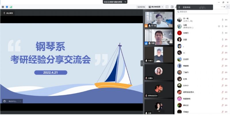 为营造优良学风,引导我系学生树立正确考研目标,进一步推进钢琴系就业创业工作高质量发展,4月21日,钢琴系通过腾讯会议组织开展线上考研经验分享交流会,党总支副书记辛德万出席会议,辅导员邓一帆和11名优秀研究生、准研究生作为嘉宾分享考研经验,钢琴系100余名学生参加分享交流会。本次会议由辅导员冯磊主持。