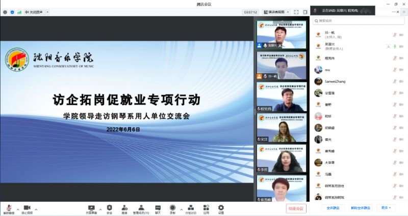 为进一步做好钢琴系2022届毕业生就业创业工作,搭建校企合作平台,拓宽毕业生就业渠道,按照学院工作部署,6月6日,钢琴系通过腾讯会议组织开展访企拓岗促就业专项行动,在线上走访6家用人单位。副院长吴厚兴出席会议,创新创业中心、就业指导中心主任宋洋、钢琴系领导班子、毕业生导师、钢琴系办公室全体人员参加会议。会议由党总支书记程宪伟主持。