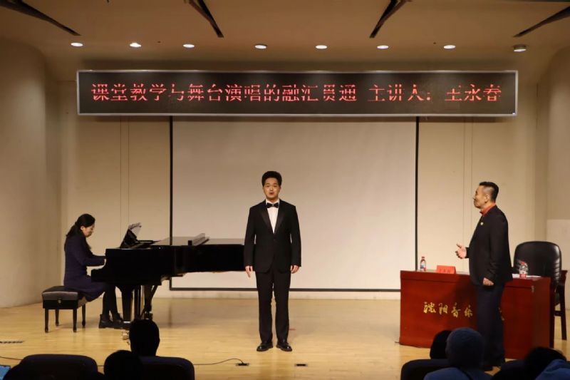 讲座中,王永春结合自身丰富的舞台演唱经验与教学实践,深入探讨了课堂教学与舞台演唱之间的紧密联系与融合之道。他指出,课堂是声乐学习的根基,要注重声乐技巧的系统训练、音乐理论知识的扎实积累以及对作品情感内涵的深度挖掘,为舞台演唱筑牢基础。同时,舞台演唱是课堂所学的实践与升华,需要在舞台上展现出良好的台风、精准的情感表达以及与观众的互动交流能力。他强调,教师在课堂教学中要引导学生建立舞台意识,让学生明白课堂所学最终是为了更好地服务舞台;而学生在舞台实践中遇到的问题,也应反馈到课堂学习中,不断完善自身的演唱能力。