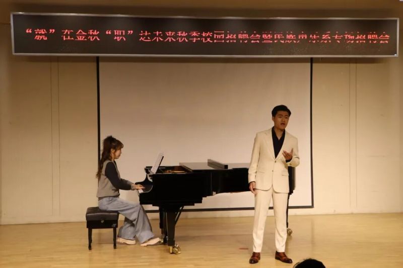 招聘会上,民族声乐系2026届研究生毕业生代表及本科生付一诺、张子奇、彭湘仁、聂子惠,以及研究生代表赵祥树、黄瑶婷、邵佳宁进行了专业展示。