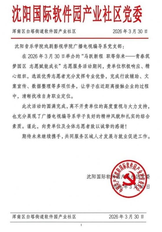 为深入贯彻党建引领基层治理、服务青年成长与产业发展要求,3月30日,沈阳音乐学院戏剧影视学院广播电视编导系党支部响应浑南区委社会工作部、共青团浑南区委及白塔街道软件园产业社区号召,参与“马跃新程 职等你来——青春筑梦园区 志愿赋能成长”志愿服务活动。支部以凝聚青年力量、服务产业振兴、践行党员使命为核心,紧扣党建赋能、服务助企、实践育人、校企联动目标,组织入党积极分子和学生志愿者走进园区非公企业,以专业所长践行初心。